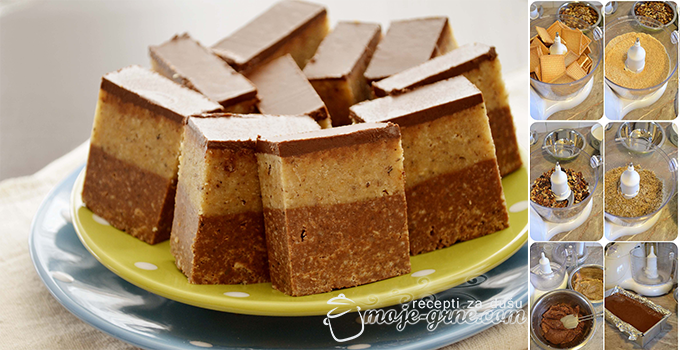 Pleh dimenzija 10×20 cm obložiti alu folijom, pa sipati tamni deo i dobro „utapkati“. Dodati preko svetli deo i dobro rasporediti.