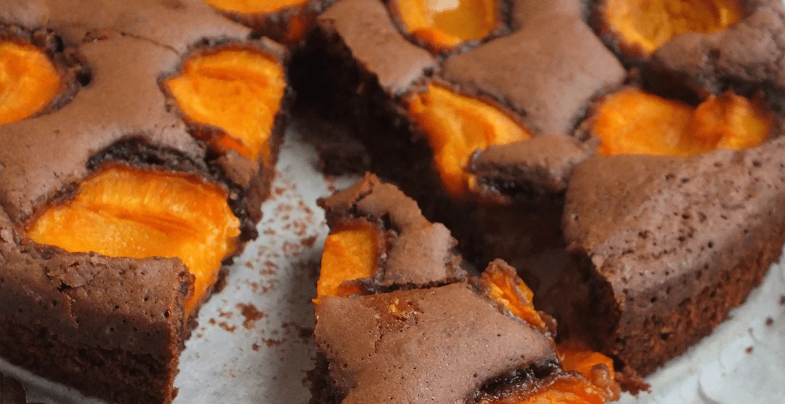 • Tepsiju od Lupo Pizza gril pekača prekriti papirom za pečenje i izliti čokoladnu smesu. Odozgo poređati kajsije isečene na pola.