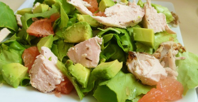 U činiji pomešati grejpfrut, avokado isečen na kockice i sitno iseckanu salatu potočarku.