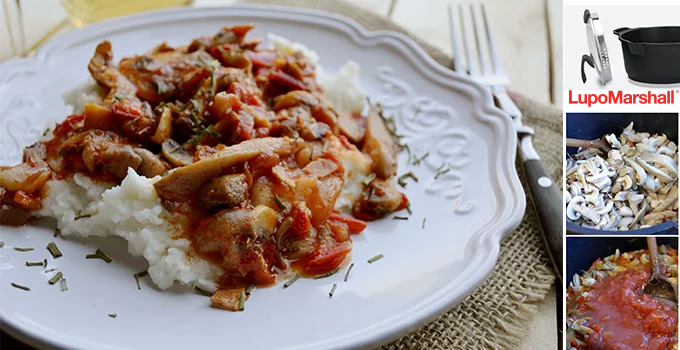 Dodati alevu papriku, so, biber po ukusu, majčinu dušicu, peršun, beli luk i paradajz i pirjaniti oko 20-tak minuta, dok pečurke ne omekšaju i ne ispari višak tečnosti.
