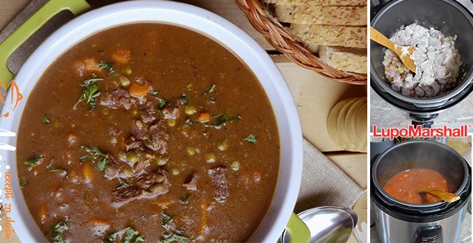 Meso dodati u lonac sa lukom, promešati, ostaviti minut-dva, pa dodati paradajz pire i supu.