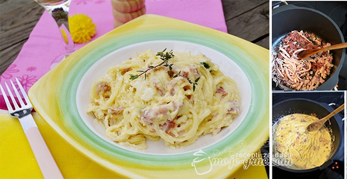 U kaseroli zagrejati maslac, staviti sitno seckanu slaninu, pečenicu i čajnu kobasicu. Zajedno par minuta propržiti, pa dodati tople, skuvane špagete. Odmah dodati smesu od pavlake i jaja, i sve kuvati uz stalno mešanje dok se masa ne zgusne.