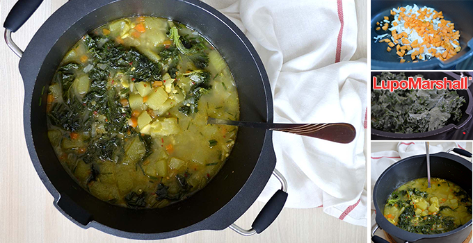 Pet minuta pred kraj dodati seckani (krupnije) lisnati kelj i sitno seckani vlašac, po potrebi još malo začiniti i poslužiti.