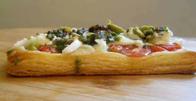 Svaku pašteticu premazati pesto sosom, pa poređati kriške paradajza. Staviti rikota sir, dodati masline i posuti parmezanom.