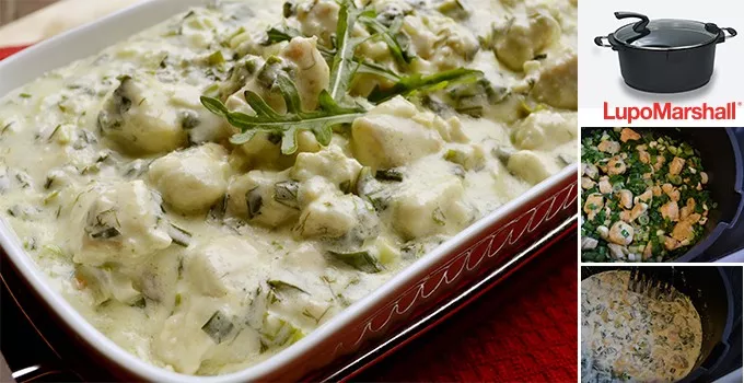 Piletinu iseckati na komade veličine zalogaja, pa je uvaljati u kukuruzno brašno, a zatim propržiti u Lupo Marshall kaseroli na zagrejanom ulju, da pobeli sa svih strana.