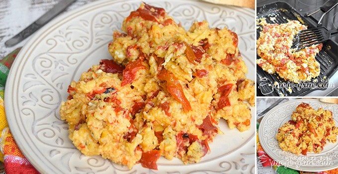 • Tiganj zagrejati, dodati papriku, preliti umućenom mešavinom i pržiti uz stalno mešanje dok se svi sastojci lepo ne sjedine i povežu. Poslužiti toplo.