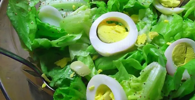• Obarena jaja očistite isecite na kolutove i pomešajte sa salatom.