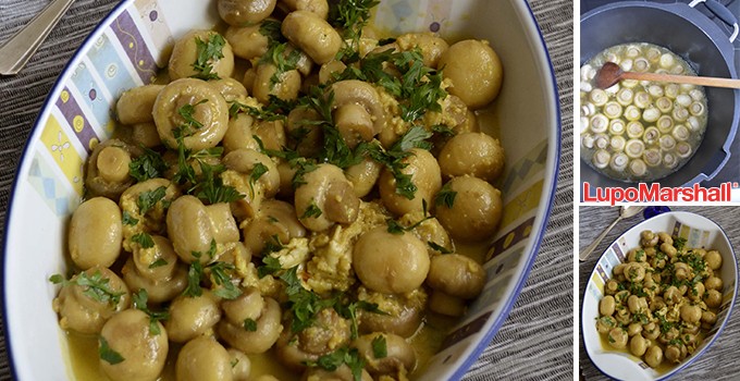 U Lupo Marshall kaseroli (šerpi) zagrejati ulje, dodati cele šampinjone, pa ih dinstati uz povremeno mešanje dok ne puste tečnost, nekih 10-tak minuta.