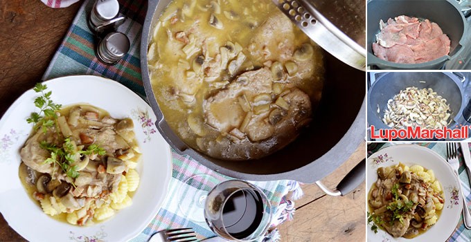 Dodati supu i vratiti šnicle u kaserolu, pa kuvati dok meso i šampinjoni ne omekšaju (povremeno šnicle okretati) i ne ispari višak tečnosti.