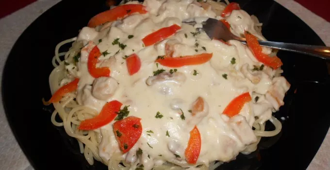 Skuvane špagete procedite, stavite ih na tanjir pa prelijte sosom od dimljenog steka.