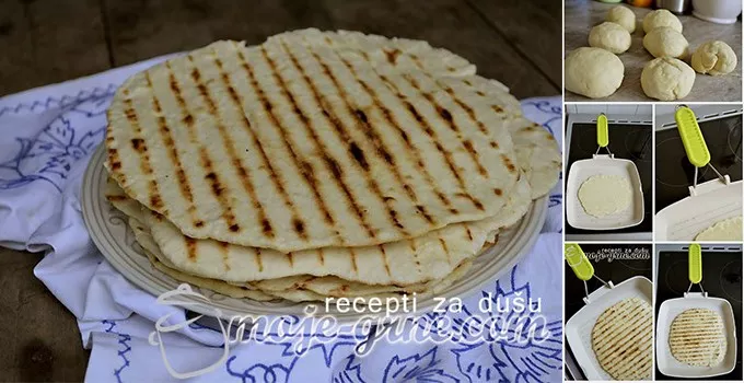 Testo odmah podeliti na 6-7 jufkica i ostaviti da malo odstoje i narastu, nekih 15-tak minuta. Svaku jufkicu tanko rastanjiti, a zatim peći na gril tiganju sa obe strane po dva minuta.