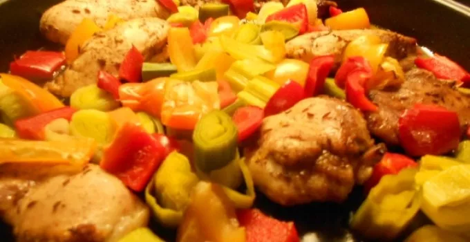 Piprema u običnoj rerni: Prethodno zagrejati rernu na 200C i u većoj posudi staviti meso da se peče oko 45 minuta. Treba da dobije lepu zlatnu kožicu. Potom dodati sve pripremljeno povrće i smestiti ga između mesa. Prekriti posudu i peći tako 10-tak minuta, a onda još 10 bez poklopca.