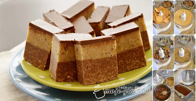 Pleh dimenzija 10×20 cm obložiti alu folijom, pa sipati tamni deo i dobro „utapkati“. Dodati preko svetli deo i dobro rasporediti.