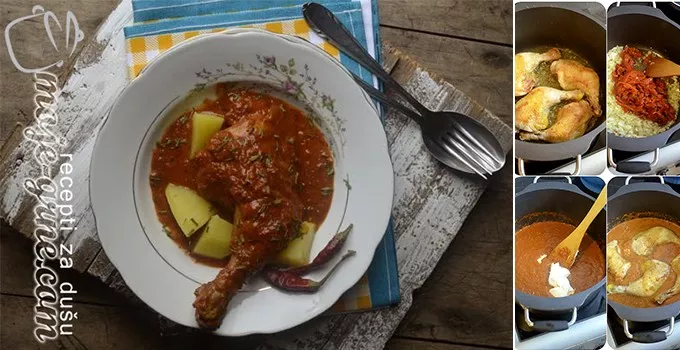 U masnoći gde su se bataci pržili, propržiti sitno seckane crni i beli luk, dok ne postanu staklasti, pa dodati sitno seckanu pečenu papriku.
