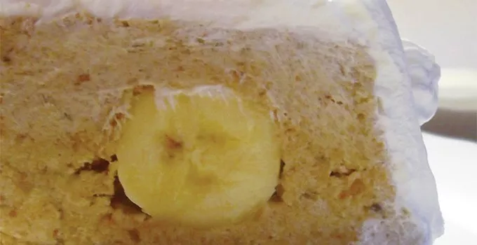 Dobijenu smesu podelite na dva dela. Manju tacnu, kao za rolat, obložite papirom za pečenje. Razmažite jedan deo smese. Preko, na sredinu ,stavite oljuštene 2 banane, a zatim razmažite drugi deo smese preko.
