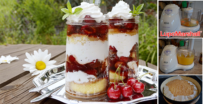 U odgovarajuću čašu staviti krug patišpanja, pa preliti desertnim prelivom, a onda preko staviti malo pripremljenih trešnji a onda sipati šlag. Preko šlaga ponovo krug patišpanja i sve tako dok se ne utroši materijal.