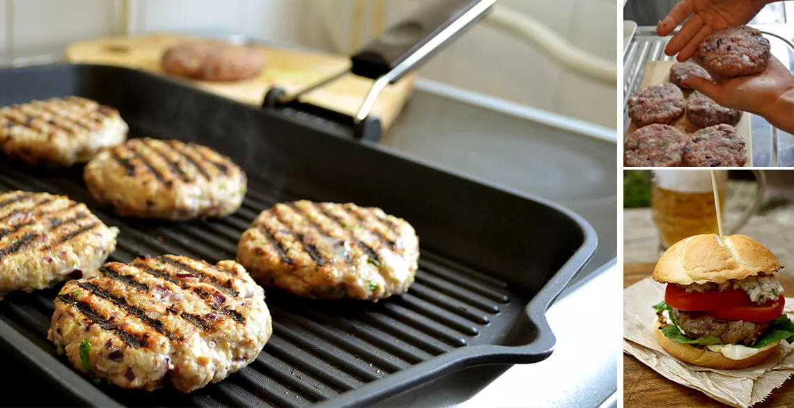 Od pripremljene mase, rukama blago nakvašenim u vodi formirati burgere. Gril tiganj Risoli zagrejati, poređati pripremljene burgere i peći po 5 minuta, otprilike, sa svake strane.