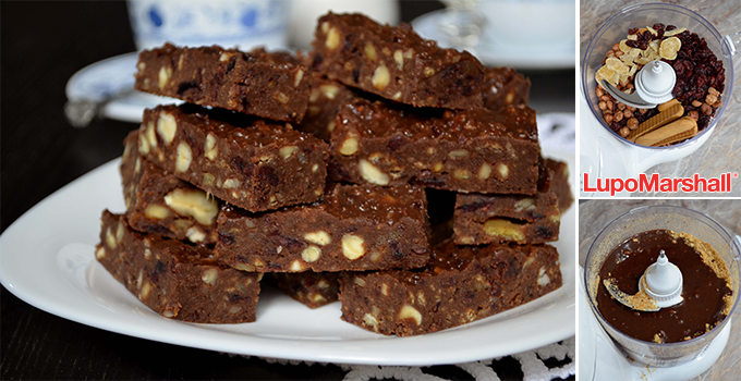 U Ema Multipraktiku, pomoću nastavka za seckanje, samleti plazmu, brusnicu, đumbir i lešnike. Suvo voće i lešnici se ne samelju skroz, ostane po koji veći komad, ali to štanglicama upravo i daje šmek.