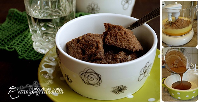Okruglu dublju posudu za pečenje obima 16-18 cm podmazati i pobrašnjaviti, pa izručiti umućenu masu.