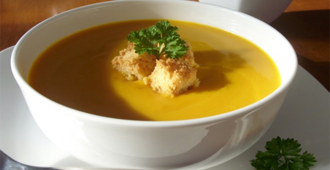 • U duboki tanjir prvo staviti bruskete ili krutone, kašiku pavlake i preko toga preliti čorbu od bundeve.