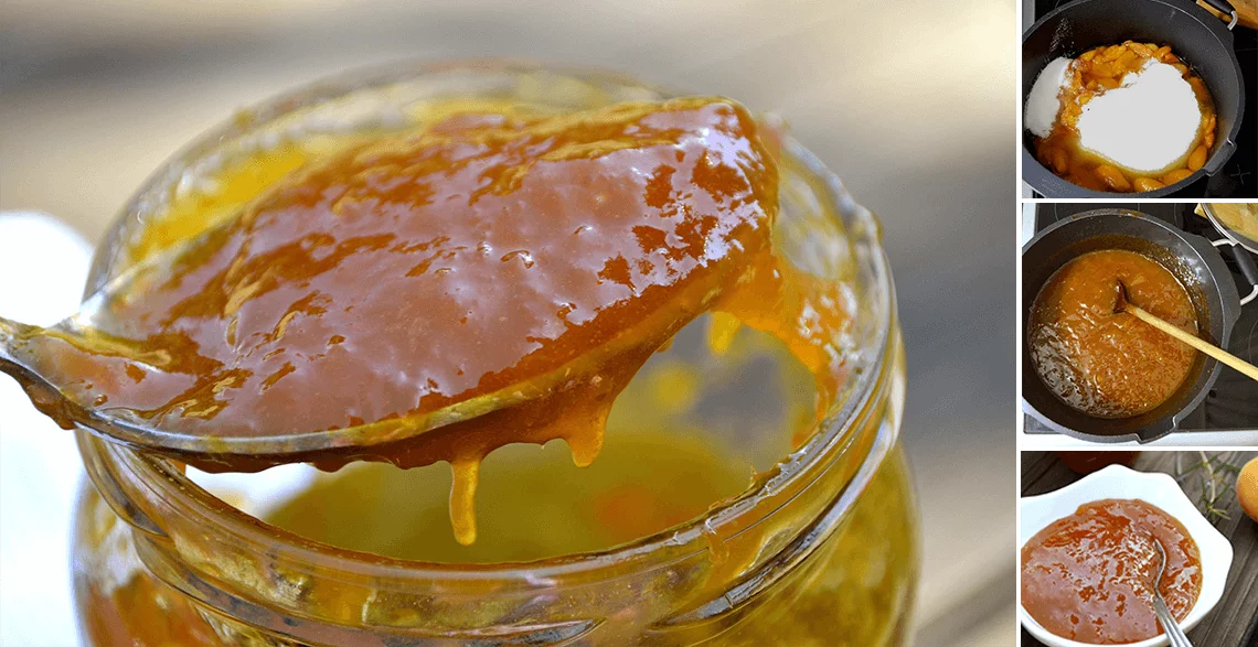 Pečene kajsije odmah prebaciti u kaserolu (šerpu) za kuvanje, pa dodati preostali šećer i vanilin šećer. Sve dobro izmešati.
