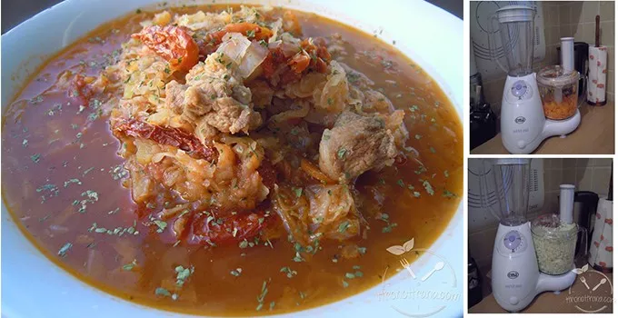 Promešati meso i začine a zatim staviti i paradajz, seckani kupus (seckan u Ema multipraktiku) i naliti ključalom vodom da tek prekrije kupus.