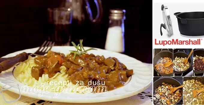 • Pred kraj začiniti po ukusu biberom i mešavinom začina, dodati alevu papriku i gustin pomešan sa vodom.