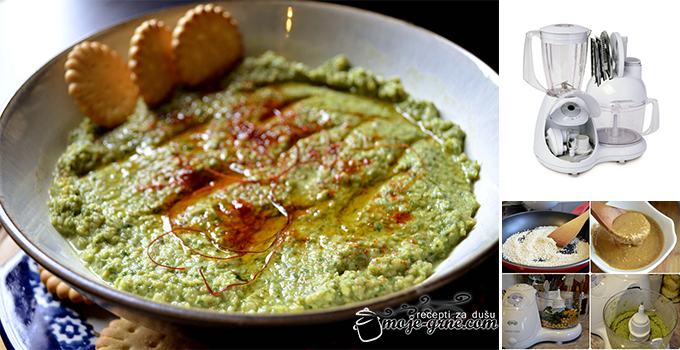 Pečeni beli luk ostaviti da se prohladi, pa ga očistiti i sa svim ostalim sastojcima (osim ulja, aleve paprike i chilli threadsa) staviti u Ema multipraktik i sve lepo sjediniti u kremastu masu.