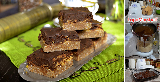 Pripremljen umasu sipati u pleh obložen papirom za pečenje, dimenzija 30x20cm. Ostaviti da se kora malo prohladi i stegne, pa je premazati kikiriki puterom, a zatim posuti kornfleksom.