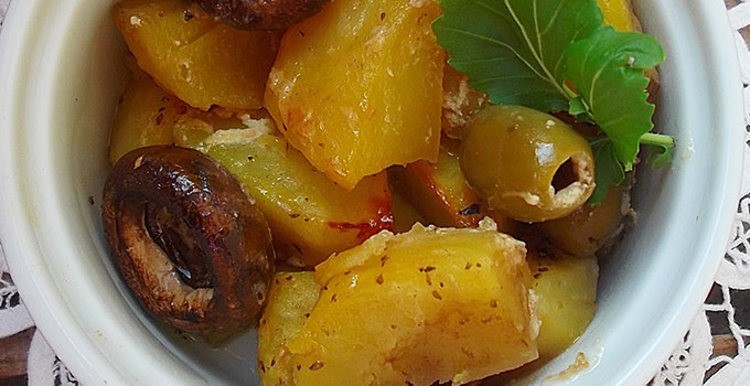 • Krompir oljuštiti i iseći na komade. Pouljiti, posoliti i ubaciti u nauljen pleh pekača.