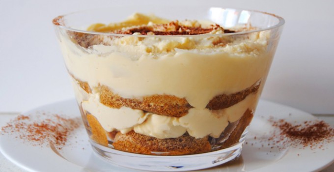 • Piškote umočiti u kafu i ređati u odgovarajuću posudu. Kada napravimo jedan sloj, premažemo polovinom krema i pospemo kakaom.