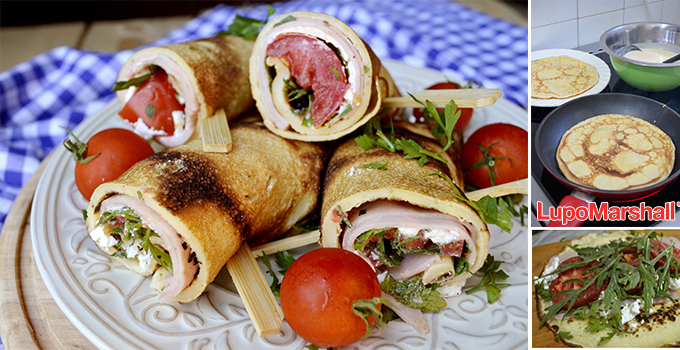 Na svaku palačinku staviti po želji režnjeve šunke, zatim mrvljeni feta sir, paradajz isečen na kolutove, posoliti i pobiberiti po ukusu. Dodati rukolu, seckani peršun i preliti sa malo maslinovog ulja. Palačinku uviti u rolnicu i preseći je na pola, pa pričvrstiti štapićem. Ponavljati postupak dok se ne utroši sav materijal.