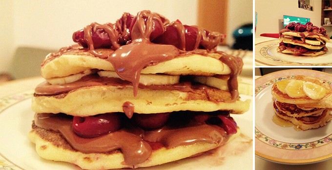 Gotove palačinke filovati eurokremom, višnjama i bananom.