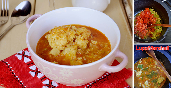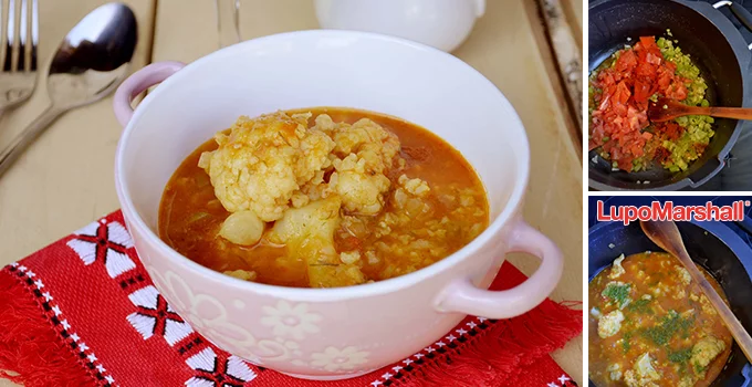 Naliti supom, začiniti, poklopiti i kuvati nekih 10-tak minuta. Dodati zatim oceđeni karfiol, lagano promešati i sve zajedno kratko prokuvati.