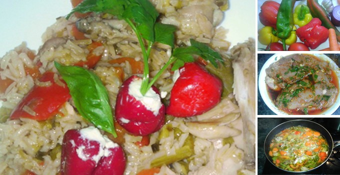 Dodati povrće, pirinač i 2 šolje vode (ako imate, još bolje bujon). Po potrebi u toku kuvanja dodati još vode.