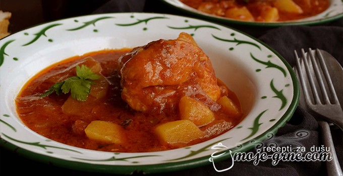 U kaserolu zatim staviti seckani paradajz sa sokom, kao i krompir iseckan na manje kockice.