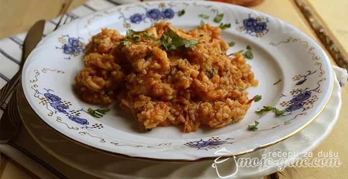 Na zagrejanom ulju u Lupo Marshall kaseroli propržiti par minuta sitno seckani crni luk i oprani pirinač.