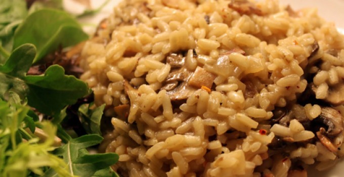 400g šampinjona 4 režnja slanine 1 slatka pavlaka 1 glavica crnog luka ulje, so, biber 2 šolje pirinča