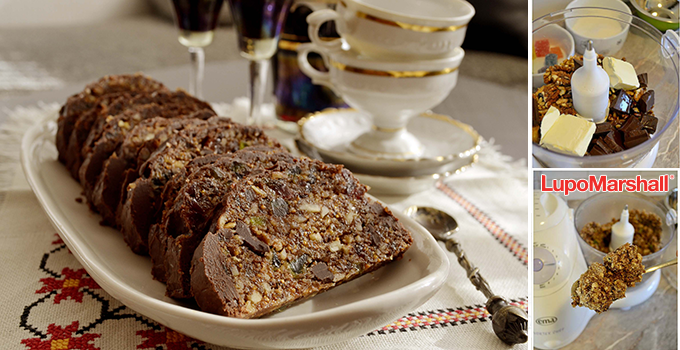 Sve sastojke (osim za glazuru) staviti u Ema multipraktik i samleti. Dobro izmešanu masu staviti na aluminijumsku foliju i formirati u rolat. Ostaviti da se stegne malo u frižideru.