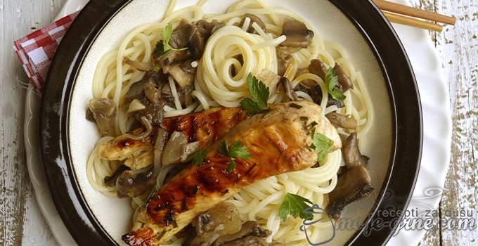 Špagete skuvati uobičajeno i poslužiti uz piletinu i prilog od šampinjona. Posuti peršunom.