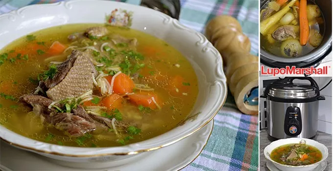 Pažljivo ispustiti pritisak iz lonca, otvoriti poklopac, pa ocediti tečnost od mesa i povrća. Vratiti supu u lonac (po potrebi naliti još oko 500 ml vrele vode) i nastaviti sa kuvanjem.