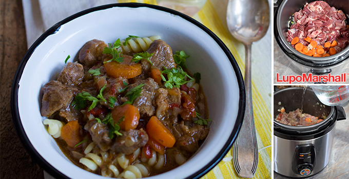 Gulaš poslužiti uz kuvanu testeninu i posuti peršunom.