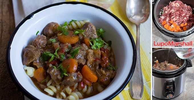 U električnom ekspres loncu zagrejati ulje pa propržiti crni luk, dodati sušeni paradajz i na kraju meso i šargarepu, pa uz mešanje propržiti malo da meso „pobeli“. Začiniti po ukusu.