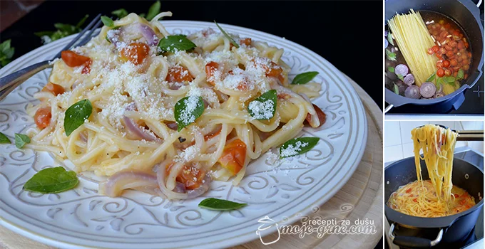 U kaserolu Lupo Marshall staviti sav potreban materijal, osim parmezana. Naliti vodom, pustiti da provri i kuvati uz mešanje dok špagete ne omekšaju i voda skoro ne ispari, nekih 10-tak minuta.