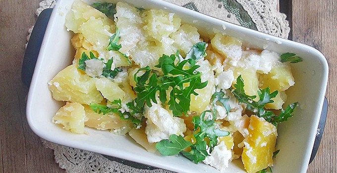 • U jedan sud izmrviti sir, iseckati rukolu i luk i dodati krompir.