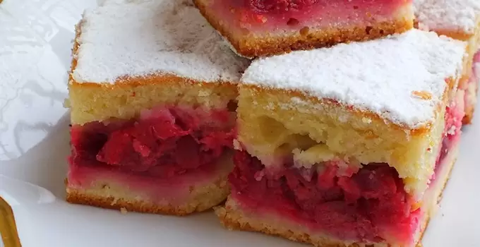 Tepsiju Pizza gril pekača obložiti pek papirom i sipati polovinu testa. Peći u zagrejanom pekaču 5 minuta, pa dodati višnje i preliti ostatak testa. Peći još nekih 15 minuta ili dok kolač postane rumen. Proverite čačkalicom, pa ako je potrebno dodajte još koji minut.