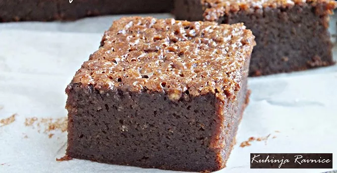 • Jedan plići pleh obložiti pek papirom, izliti smesu i peći na 160 C oko 30 minuta.