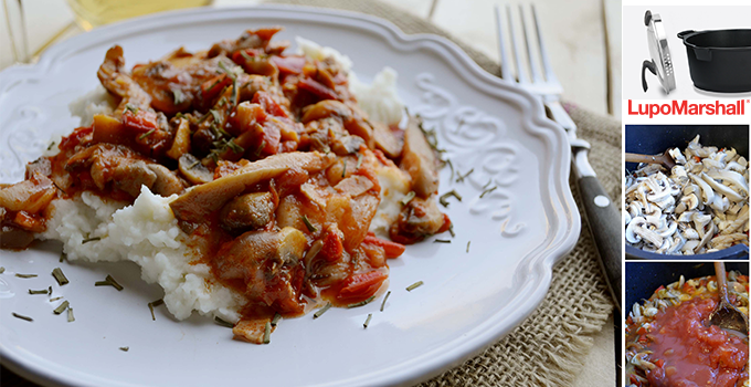 Dodati alevu papriku, so, biber po ukusu, majčinu dušicu, peršun, beli luk i paradajz i pirjaniti oko 20-tak minuta, dok pečurke ne omekšaju i ne ispari višak tečnosti.