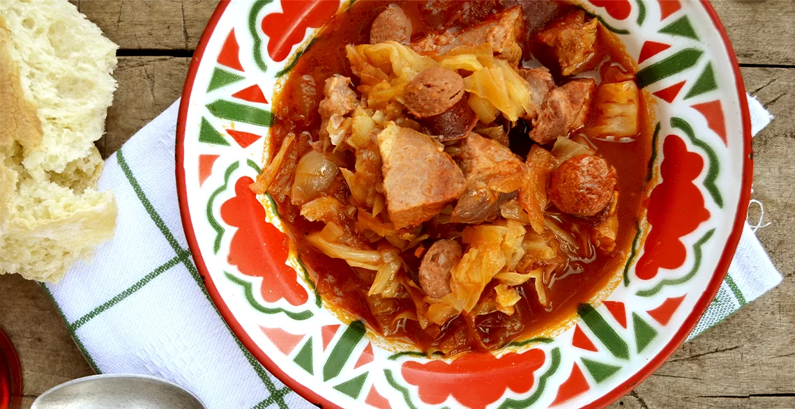 • Dodati zatim meso isečeno na kockice, kao i kobasicu. Nastaviti sa kuvanjem dok meso i povrće ne omekšaju.