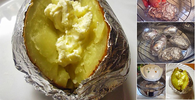 Krompir oprati, uviti u alu foliju, pa pažljivo poslagati na rešetku turbo pećnice. Poklopiti pećnicu i pojačati temperaturu na 230 C, a tajmer podesiti na 30 minuta.